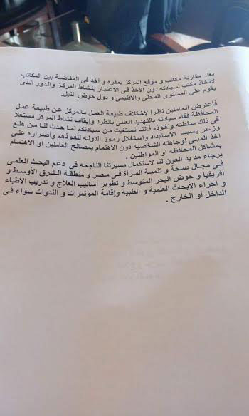 وجَّه المركز الإقليمي لصحة المرأة، خطاب استغاثة لعبدالفتاح السيسي؛ بشأن تهديدات المهندس محمد عبدالظاهر، محافظ الإسكندرية، ورغبته في الحصول على مبنى المركز بمنطقة محطة الرمل، ما يهدد نشاطه الخاص بصحة المرأة.