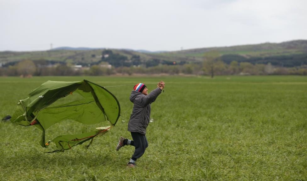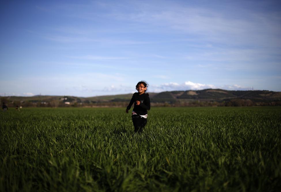5- فتاة تجري عبر الحقول، في مخيم مؤقت للمهاجرين بالقرب من الحدود اليونانية-المقدونية.