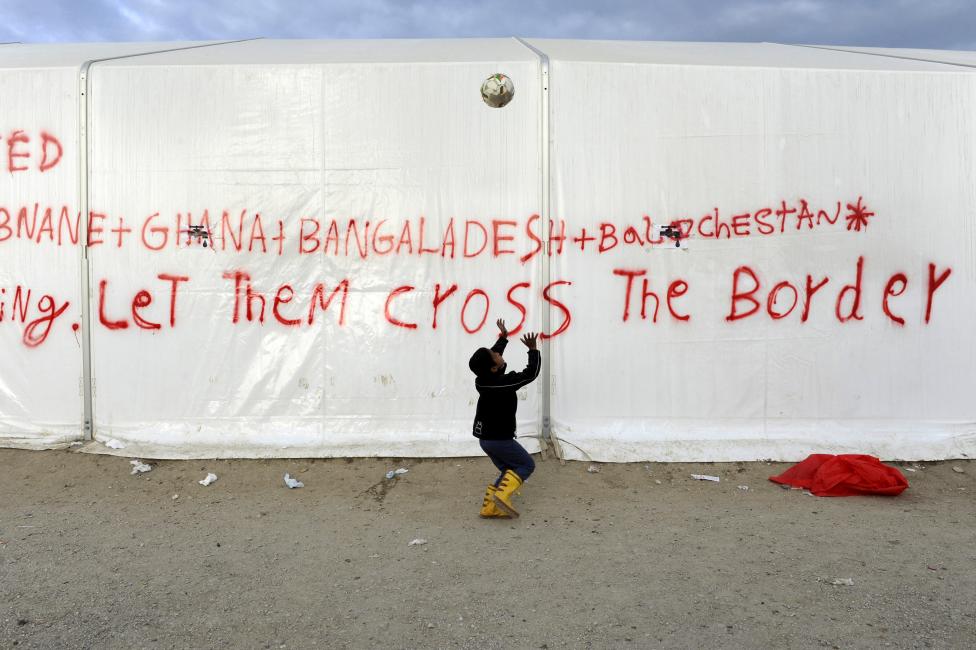 3- طفل صغير يلعب بالكرة في انتظار السماح لهم بعبور الحدود المقدونية.