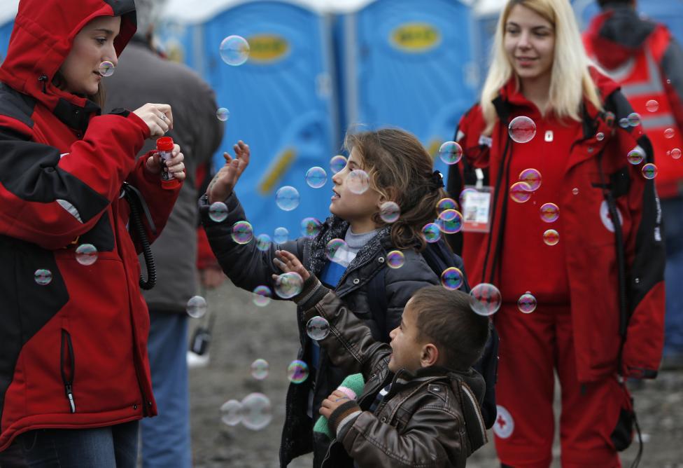 6- متطوعون يحاولون رسم البسمة على وجوه الأطفال، ويلعبون معهم بفقاعات المياه، قبل مواصلة رحلة القطار إلى أوروبا الغربية في مخيم مؤقت للاجئين في سلافونسكي برود على الحدود الكرواتية.