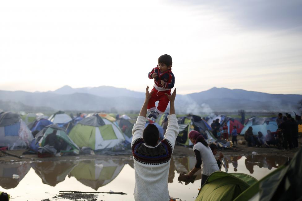 7- أب يلاعب طفله في مخيم غمرته المياه، في انتظار عبور الحدود اليونانية-المقدونية.