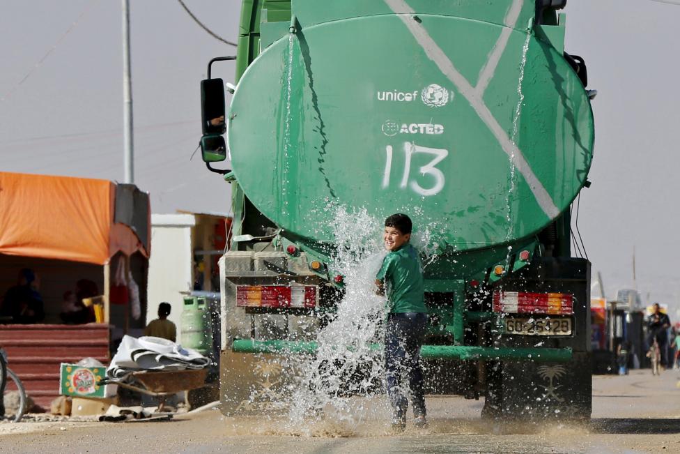 8- طفل يلعب بمياه صهريج في مخيم الزعتري للاجئين في مدينة المفرق الأردنية، بالقرب من الحدود مع سوريا.