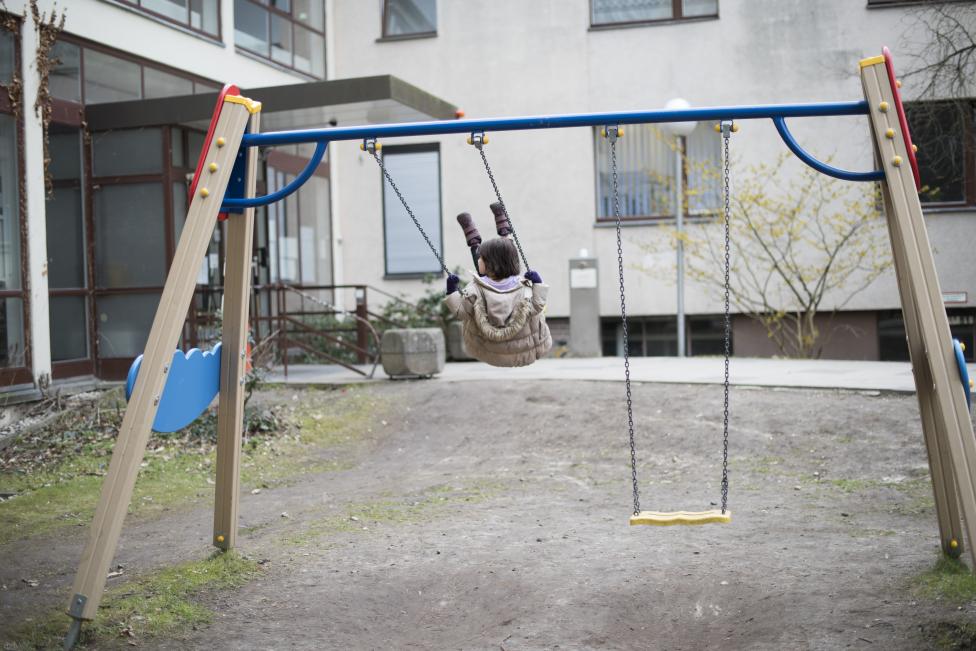 11- طفلة تلعب على أرجوحة خارج ملجأ للاجئين، في برلين، ألمانيا.