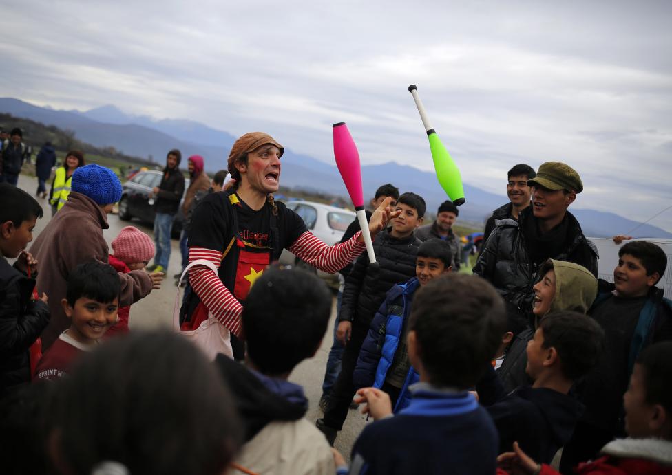 12- قسوة الحياة في المخيمات، يجب أن يقطعها القليل من المرح، فيتطوع البعض لإدخال البسمة على الأطفال، فهنا مهرج يسلي المهاجرين في مخيم مؤقت على الحدود اليونانية-المقدونية.