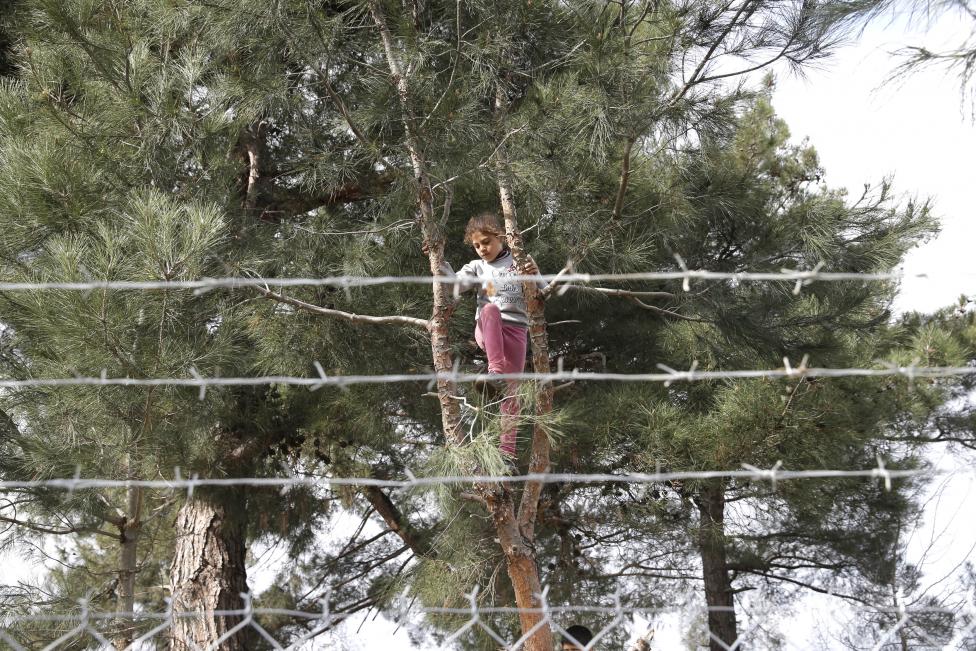 13- الأطفال تتعامل مع الطبيعة بلا خوف، فلن يروا أكثر مما رأوه في بلدهم، فتجد فتاة صغيرة تتسلق شجرة في مخيم المهاجرين بالقرب من السياج الحدودي اليوناني-المقدونية.