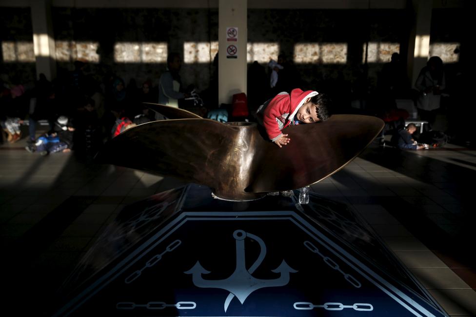 14- طفل وجد الراحة على تمثال المروحة داخل المحطة، بعد وصولهم على متن بلو ستار سفينة الركاب، من جزر ليسبوس وخيوس في ميناء بيرايوس، في أثينا، اليونان.