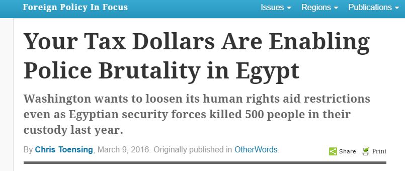 وقال التقرير إن العنف الذي مارسته الشرطة الأمريكية، تعرض لانتقادات عنيفة من قبل النشطاء والمواطنين الأمريكيين على حد سواء، ومع ذلك فإن الحكومة الأمريكية تتغاضى عن قمع الشرطة في الدول الصديقة، فعلى سبيل المثال تقوم الحكومة المصرية بتضييق الخناق على مواطنيها الغاضبين أقسى من أي وقت مضى، بينما تنظر الولايات المتحدة التي ترسل إليها ما يزيد على 1 مليار دولار -من أموال دافعي الضرائب- في الاتجاه الآخر وتغض الطرف عن تلك الممارسات، ويشكل ضباط الشرطة في مصر مصدر تهديد للمواطنين، كما أنهم يطالبون سائقي المركبات بدفع الرشاوى تحت أي ذريعة، ويسخدمون العنف المميت وفقًا لنزواتهم.