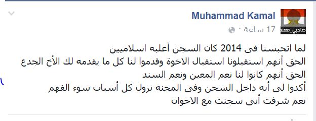 وأضاف “كمال” -عبر منشور له على “فيس بوك”- “لما اتحبسنا في 2014 كان السجن أغلبه إسلاميين، الحق أنهم استقبلونا استقبال الأخوة وقدموا لنا كل ما يقدمه لك الأخ الجدع..الحق أنهم كانوا لنا نعم المعين ونعم السند”.