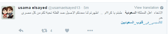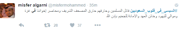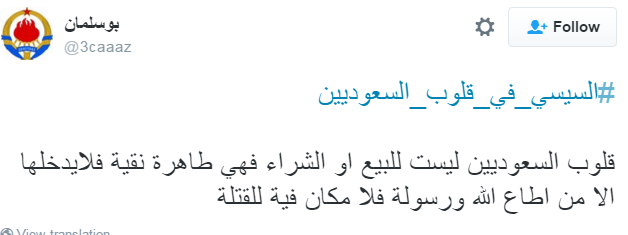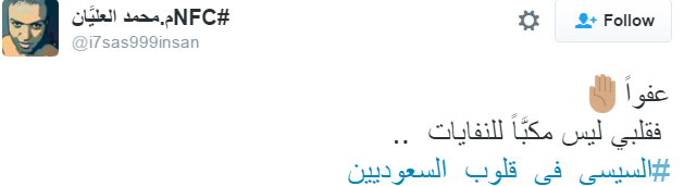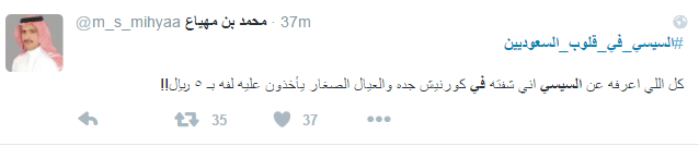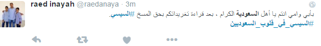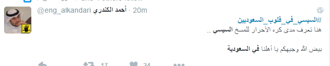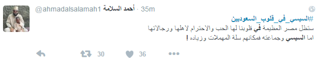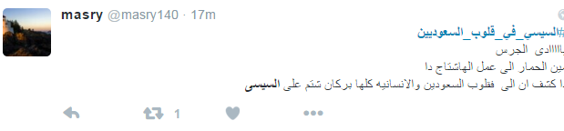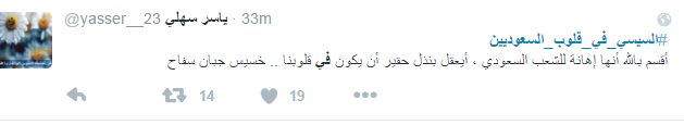 استخدم العديد من مغردي موقع التدوين المصغر “تويتر” هاشتاج “السيسي في قلوب السعوديين” للهجوم على السيسي، إذ تحول الهاشتاج الذي دشنه البعض في السابق لمدح السيسي إلى وسيلة لإدانة السيسي والسخرية منه.