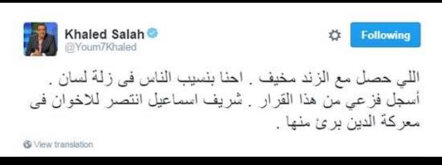 وقال خالد صلاح عبر حسابه الشخصي بموقع التواصل الاجتماعي “تويتر”: “اللي حصل مع الزند مخيف، إحنا بنسيب الناس في زلة لسان، أسجل فزعي من هذا القرار، شريف إسماعيل انتصر للإخوان في معركة الدين بريء منها”.