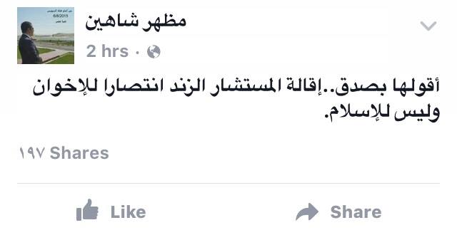 وكتب “شاهين”، عبر صفحته الشخصية بموقع التواصل الاجتماعي “فيس بوك”، مساء أمس الأحد: “أقولها بصدق.. إقالة المستشار الزند انتصار للإخوان وليس للإسلام”.