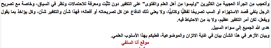 واستطرد “برهامي”: “أتعجب مِن الجرأة العجيبة مِن الكثيرين وليسوا مِن أهل العلم والفتوى على التكفير دون تثبُّت ومعرفة للاحتمالات ونظر في السياق، وخاصة مع تصريح الرجل بنفي قصد الاستهزاء أو السب تصريحًا لفظيًّا وكتابيًّا، ولا يعني ذلك الدفاع عن كل تصريحاته أو أفعاله؛ فهذا شأن والتكفير شأن، وكل يؤاخذ بما يقول ويفعل، لكن أمر التكفير عظيم، ولا بد مِن الاحتياط فيه”.