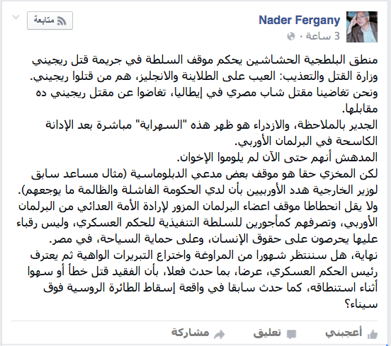 وقال “فرجاني” -خلال منشور على صفحته على موقع التواصل الاجتماعي “فيس بوك”-: وزارة القتل والتعذيب قالت: “العيب على الطلاينة والإنجليز، هم من قتلوا ريجيني.. ونحن تغاضينا عن مقتل شاب مصري في إيطاليا، تغاضوا عن مقتل ريجيني ده مقابلها”.