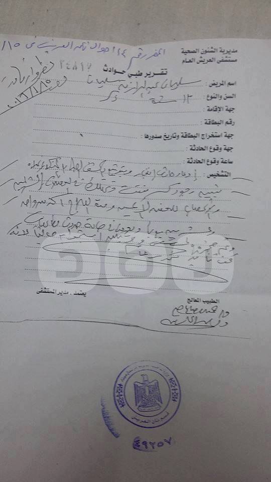 يروي عم الطفل سليمان ماحدث : سقطت قذيفة علي منزلنا اصيب سليمان واخوه ولكن حالة اخوه كانت أصعب فتم تحويله للاسماعلية ، وبمجرد ان وصلنا للمستشفي جاءنا امن المستشفي واجري التحقيق معنا ، ورغم ان الاطباء كانوا يقولون لهم: مش وقته وانهم مشغولين بالتعامل مع الحالة ولكن أمن المستشفي كان يصر علي اكمال التحقيق فنكتب مثلما يريدون، فلا احد يجرؤ علي قول غير ان القذيفة مجهولة او يحاول الاعتراض .