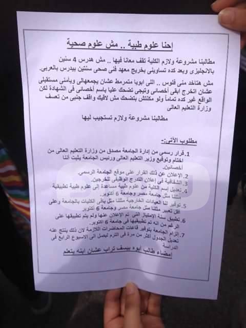 لليوم الثاني علي التوالي، نظم طلاب كلية العلوم الطبية وقفات احتجاجية بجامعات فاروس وأكتوبر ومصر؛ احتجاجا على قرار وزير التعليم العالي بتغيير الجامعة من العلوم الطبية إلى العلوم الصحية وتحويل مسمى الطلبة من أخصائي إلى فني.