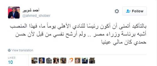 كتب شوبير في تغريدة له على موقع التواصل الاجتماعي “تويتر”: “بالتأكيد أتمنى أن أكون رئيسًا للنادي الأهلي يومًا ما، فهذا المنصب أشبه برئاسة وزراء مصر.. ولم أرشح نفسي من قبل لأن حسن حمدي كان مالي عينيا”.
