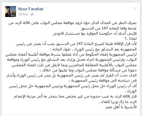 أكد الفقيه الدستوري، نور فرحات، أن وزير العدل المُقال، المستشار أحمد الزند، ما زال يشغل منصب وزير العدل وفقًا للدستور، وذلك من خلال تعليق نشره عبر حسابه الشخصي بموقع التواصل الاجتماعي “فيس بوك”.