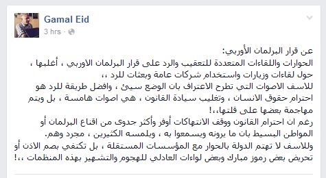 أكد الباحث السياسي، جمال عيد، أن أفضل رد على البرلمان الأوروبي، بعد كارثة مقتل “ريجيني”، هو احترام القانون ووقف الانتهاكات، وذلك خلال تعليق نشره عبر حسابه الشخصي بموقع التواصل الاجتماعي “فيس بوك”.