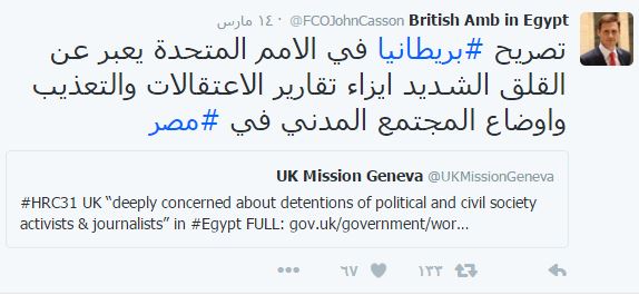 ونشر “جون كاسن”، السفير البريطاني لدى القاهرة من خلال تغريدة نشرها عبر حسابه الرسمي بموقع التغريدات القصيرة “تويتر” تصريح بريطانيا في الأمم المتحدة، والذي يعبر عن “القلق الشديد، من الاعتقالات والتعذيب في مصر وأوضاع المجتمع المدني”.