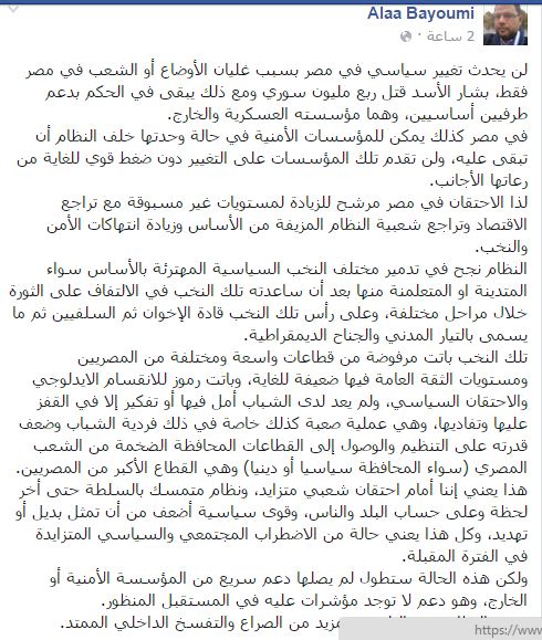 وضرب “بيومي” مثالا لنظام بشار الأسد الذي قتل ربع مليون سوري، ومع ذلك يبقى في الحكم بدعم طرفين أساسيين، وهما مؤسسته العسكرية والخارج، مشيرا إلى أنه في مصر كذلك يمكن للمؤسسات الأمنية في حالة وحدتها خلف النظام أن تبقى عليه، ولن تقدم تلك المؤسسات على التغيير دون ضغط قوي للغاية من رعاتها الأجانب.