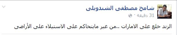 وقال الكاتب والمخرج شامخ مصطفى الشندويلي، عبر منشور له على “فيسبوك”: “الزند خلع على الإمارات.. من غير ما يتحاكم على الاستيلاء على الأراضي”.