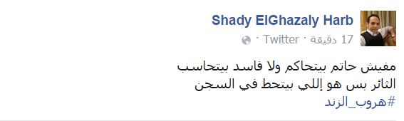 وشارك الناشط السياسي شادي الغزلي حرب، عبر منشور له على “فيسبوك” قال فيه: “مفيش حاتم بيتحاكم ولا فاسد بيتحاسب.. الثائر بس هو اللي بيتحط في السجن”.