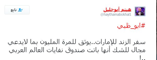 ورأى الحقوقي هيثم أبوخليل، مدير مركز ضحايا لحقوق الإنسان -عبر تغريدة له على “تويتر”- أن “سفر الزند للإمارات، يوثق للمرة المليون بما لا يدع مجالا للشك أنها باتت صندوق نفايات العالم العربي..!”.