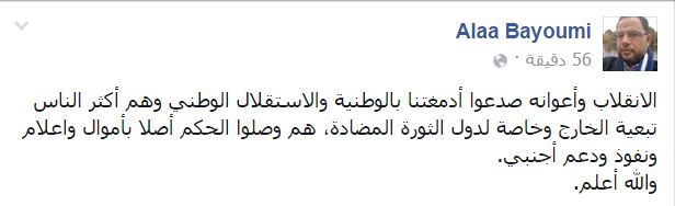 وقال الباحث السياسي علاء بيومي إن أتباع الانقلاب المدّعون للوطنية هم الأكثر تبعية للخارج وخاصة لدول الثورة المضادة، بحسب وصفه.