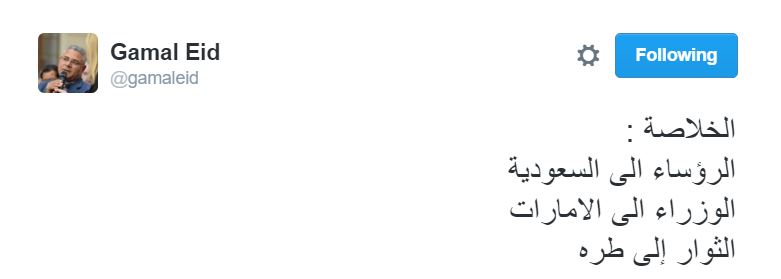 وسخر الحقوقي جمال عيد، مدير الشبكة العربية لمعلومات حقوق الإنسان، من سفر “الزند”، عبر تغريدة له على “تويتر”: “الرؤساء إلى السعودية، الوزراء إلى الإمارات ، الثوار إلى طره”.