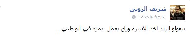 وسخر شريف الروبي، عضو حركة 6 أبريل، من الخبر أيضا، وذلك عبر منشور له على “فيسبوك” قال فيه: “بيقولوا الزند أخد الأسرة وراح يعمل عمرة في أبو ظبي”.