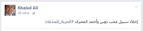 وقال علي في تعليقه: “إخلاء سبيل محب دوس وأحمد المصري الحرية للجدعان”.