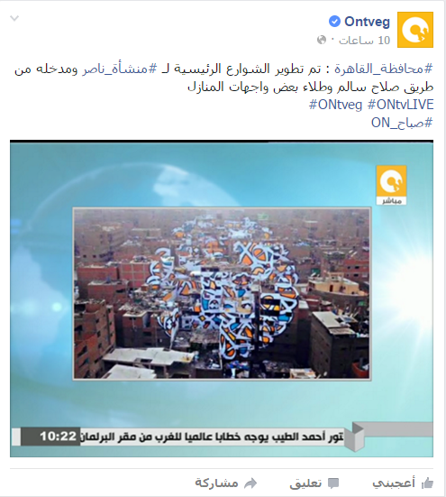 نسبت محافظة القاهرة مشروعا للفنان التونسي "el seed" في الشوارع الرئيسية لـ"منشأة ناصر" إلى نفسها، وقالت إنها قامت بطلاء بعض واجهات المنازل