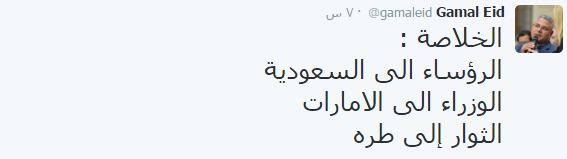 وعلق الناشط الحقوقي جمال عيد، عبر حسابه الشخصي بـ”تويتر”، قائلًا: “الرؤساء إلى السعودية، الوزراء إلى الإمارات، الثوار إلى طرة.. قسمة حنظلة”.