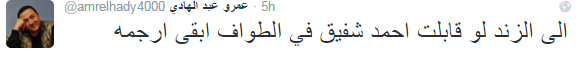 وسخر عضو جبهة الضمير، عمرو عبدالهادي، من اختيار الزند أبوظبي مثلما اختارها المرشح الرئاسي الخاسر أحمد شفيق، فقال: “إلى الزند لو قابلت أحمد شفيق في الطواف ابقى ارجمه”.