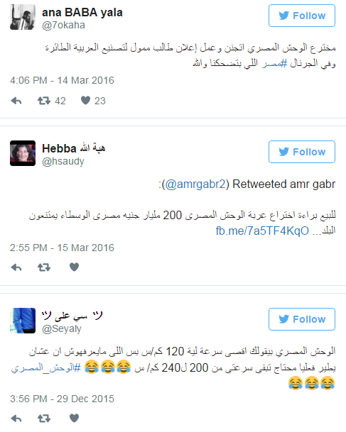 وجاء هذا الاختراع بعد ما يقرب من شهرين من ظهور “الوحش المصري” بميدان التحرير، وهي سيارة برمائية بأجنحة فشلت تجربتها، ونال الوحش المصري سخرية لاذعة من الشبكات الاجتماعية، جعلت صاحبها يقوم بحرقها ويلقيها في “الترعة” لعدم تقدير أحد لاختراعه.
