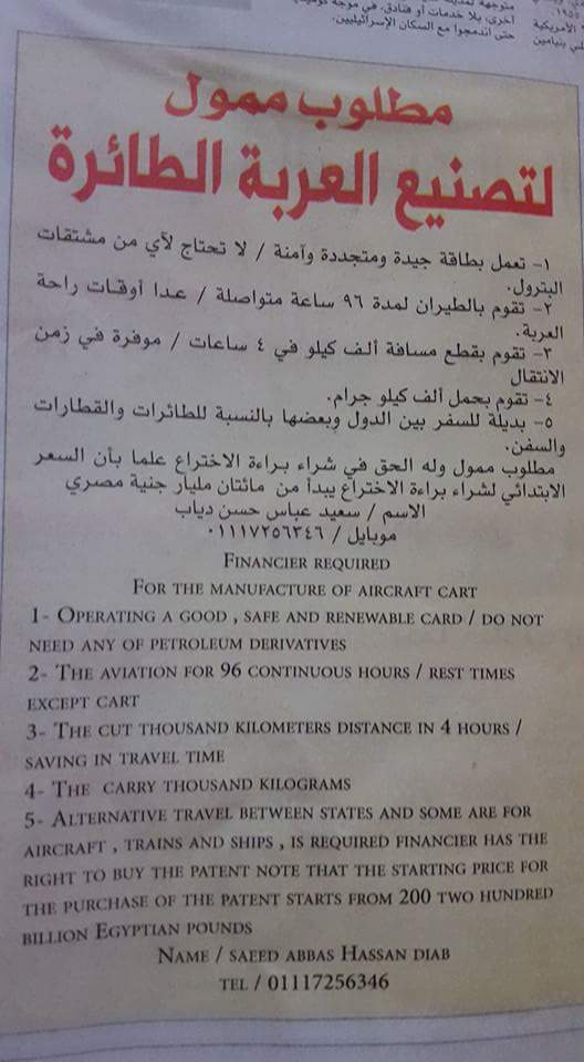 والإعلان المنشور عن العربة الطائرة، والذي تناقلته الشبكات الاجتماعية بكثافة، يبحث فيه المخترع عن ممول للاختراع، يشتري براءة الاختراع من صاحبه، ووضع رقم هاتفه المحمول في الإعلان، منبهاً أن ثمن براءة الاختراع يبدأ من مئتي مليار جنيه.
