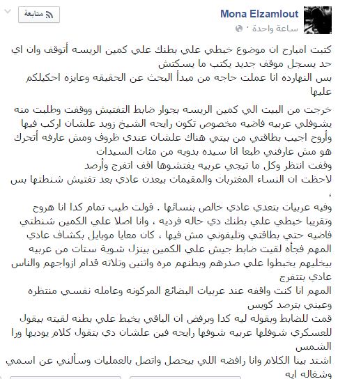 واختتمت منشورها قائلة: “قولوا للضابط اللي كانت عندك اليوم ورفعت عليها السلاح واتخانقت معاك في الكمين دي منى الزملوط مش سعاد بائعة الملابس يمكن يندم إنه لم يقسمني نصين بالرصاصة، البلد دي أنا ندمت إني ضيعت وقتي فيها ومليش فيها حاجة ويا رب تبقى معجنة بجبنكم علشان نعرف الظالم من المظلوم ونخلص”.