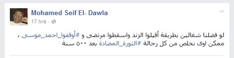 وقال سيف الدولة في تعليقه إن طريقة استخدام مواقع التواصل الاجتماعية للتخلص من رجال الثورة المضادة تحتاج إلى 500 سنة للقضاء عليهم، في إشارة منه إلى ضرورة قيام ثورة شعبية للقضاء عليهم؛ بحسب رأي بعض المعلقين.