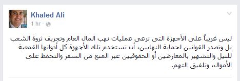 انتقد المحامي الحقوقي خالد علي استخدام نظام السيسي أدواته القمعية في التشهير بمعارضيه، وذلك خلال تعليق نشره عبر حسابه الشخصي بموقع التواصل الاجتماعي “فيس بوك”.
