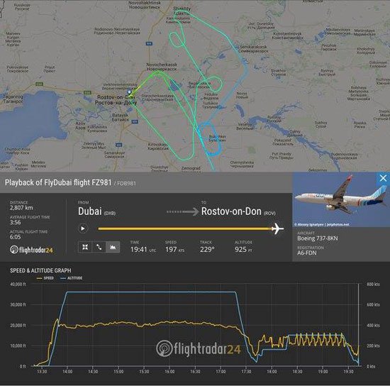 أعلنت وسائل الإعلام الروسية اليوم السبت، عن تحطم طائرة إماراتية، تابعة لشركة "فلاي دبي" قبل نهاية رحلتها بحوالي 100 متر قبل الهبوط في مطار "روستوف أون دون" جنوبي روسيا، ومقتل جميع راكبيها الذي بلغ عددهم 62 شخصًا