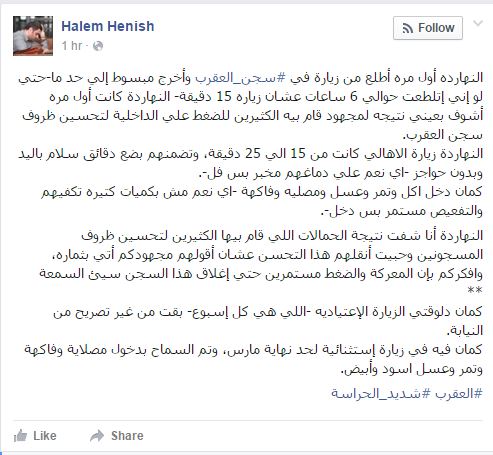 وقال حنيش -في منشور له على موقع التواصل الاجتماعي “فيسبوك”-: النهارده زيارة الأهالي كانت من 15 إلى 25 دقيقة، وتضمنتها بضع دقائق سلام باليد وبدون حواجز، أي نعم على دماغهم مخبر بس فل، كمان دخل أكل وتمر وعسل ومصلية وفاكهة، أي نعم مش بكميات كتيرة تكفيهم والتفعيص مستمر بس دخل”.
