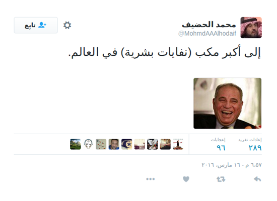 وكان الحضيف قد علّق على خبر تناول زيارة وزير العدل المصري السابق أحمد الزند إلى الإمارات، بالتغريد عبر حسابه الرسمي على تويتر، قائلاً “إلى أكبر مكب نفايات بشرية في العالم”، وهو ما اعتبرته السلطات السعودية تجاوزًا لكل الخطوط الحمراء، وللقوانين السعودية الواضحة التي تمنع مثل هذا التعريض والتحريض.