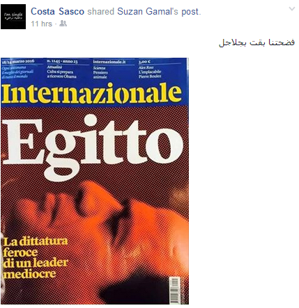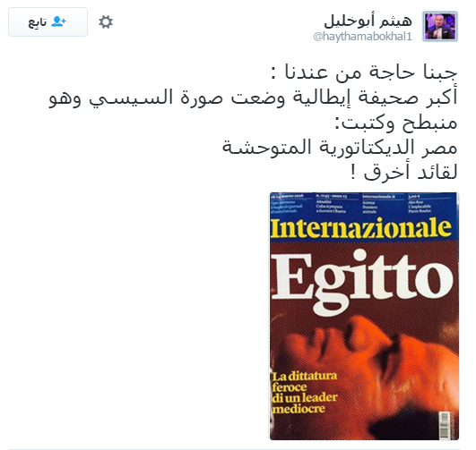 وقال الإعلامي “هيثم أبوخليل” عبر حسابه بموقع التغريدات القصيرة “تويتر”: “جبنا حاجة من عندنا؟ أكبر صحيفة إيطالية وضعت صورة السيسي وهو منبطح وكتبت: مصر الديكتاتورية المتوحشة لقائد أخرق!”.