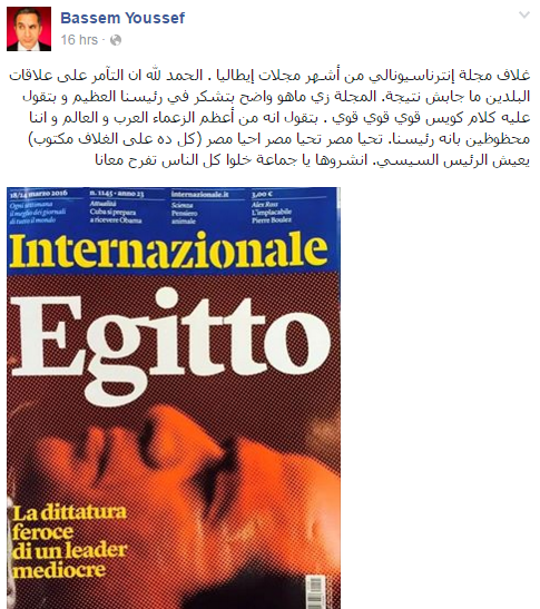 وكتب يوسف، على صفحته الشخصية بموقع التواصل الاجتماعي “فيس بوك”: “غلاف مجلة إنترناسيونالي من أشهر مجلات إيطاليا.. الحمد لله إن التآمر على علاقات البلدين مجبش نتيجة، المجلة زي ما هو واضح بتشكر في رئيسنا العظيم، وبتقول عليه كلام كويس من أعظم الزعماء العرب والعالم، وإننا محظوظين بإنه رئيسنا”!! بحسب نص التدوينة.