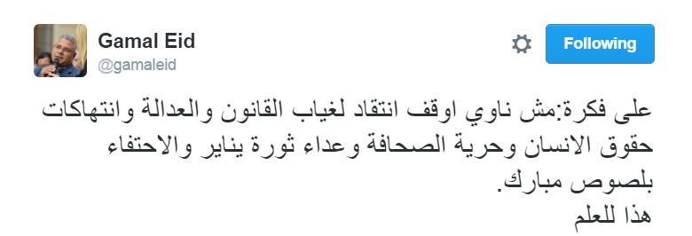 يقول جمال عيد، مدير الشبكة العربية لمعلومات حقوق الإنسان -عبر “تويتر”-: “على فكرة مش ناوي أوقف انتقاد لغياب القانون والعدالة وانتهاكات حقوق الإنسان وحرية الصحافة وعداء ثورة يناير والاحتفاء بلصوص مبارك، هذا للعلم”.