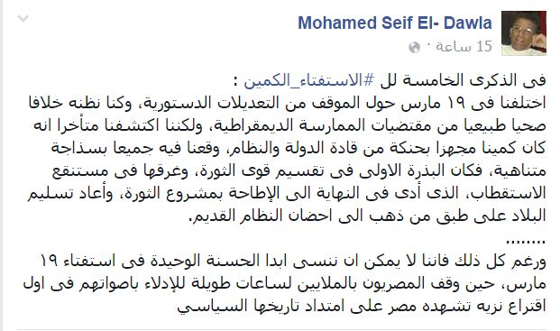 وأوضح “سيف الدولة” أنه “ورغم كل ذلك فإننا لا يمكن أن ننسى أبدًا الحسنة الوحيدة في استفتاء 19 مارس، حين وقف المصريون بالملايين لساعات طويلة للإدلاء بأصواتهم في أول اقتراع نزيه تشهده مصر على امتداد تاريخها السياسي”.