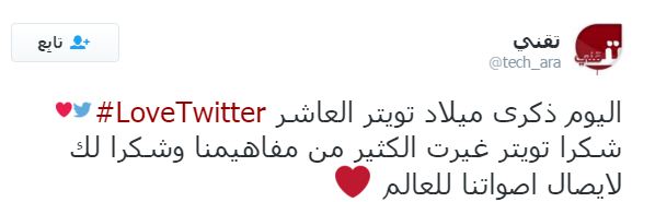 – تقني: “اليوم ذكرى ميلاد تويتر العاشر #LoveTwitter شكرًا تويتر غيرت الكثير من مفاهيمنا وشكرًا لك لإيصال أصواتنا للعالم”.