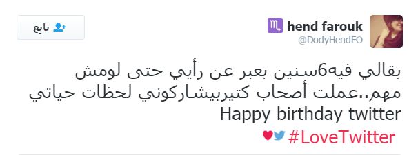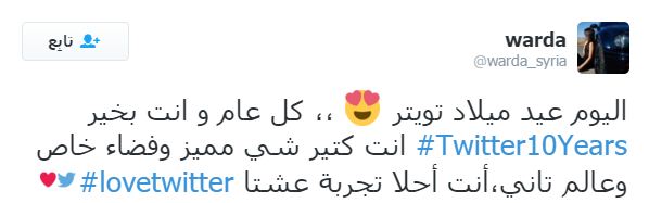 Warda –: “اليوم عيد ميلاد تويتر، كل عام وأنت بخير #Twitter10Years إنت كتير شي مميز وفضاء خاص وعالم تاني، أنت أحلى تجربة عشتها”.