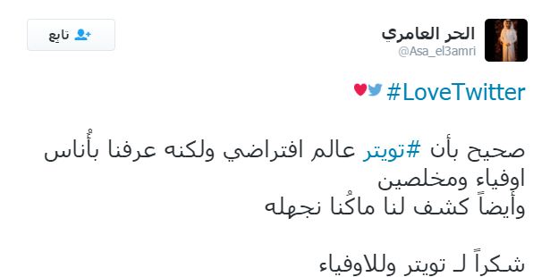 – الحر العامري: “صحيح بأن تويتر عالم افتراضي ولكنه عرفنا بأُناس أوفياء ومخلصين، وأيضًا كشف لنا ما كُنا نجهله”.
