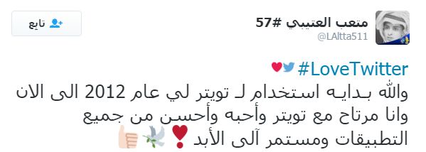 – متعب العتيبي: “والله بـدايـة استخدامي لـ تويتر لي عام 2012، إلى الآن وأنا مرتاح مع تويتر وأحبه وأحسن من جميع التطبيقات ومستمر إلى الأبد”.